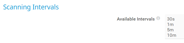 Define the scanning intervals available in the dropdown list of every object's settings. In the text field, enter one value in each line. Use s, m, h, and d to define seconds, minutes, hours, and days. By default, the following scanning intervals are available: