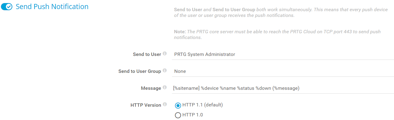 Send to User, Send to User Group, and Send to Email Address all work simultaneously. Because of this, you can define more than one user as a recipient of this notification. PRTG sends the email notifications to the active email notification contacts of the user that you select, to the active email notification contacts of all members of the user group that you select, and to all email addresses that you enter under Send to Email Address.