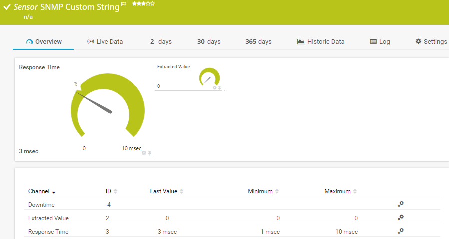 The SNMP Custom String sensor monitors a string returned by a specific object identifier (OID) via the Simple Network Management Protocol (SNMP). It can check for keywords. If you want to set limits to the channel value, you can also extract a numeric value contained in the string.